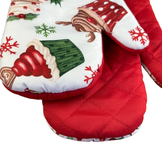 Zestaw 2 rękawic kuchennych z nadrukowanym zimowym motywem - płatki śniegu, muffinki.